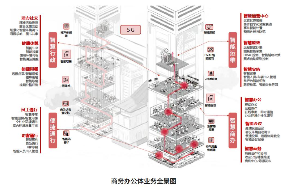 從用戶旅程的視角,圍繞以人為本、綠色高效和業(yè)務(wù)增值的目標(biāo),分別從便捷通行、智慧商辦、智慧行政和智慧運維幾個維度,勾勒商辦園區(qū)的智慧化場景和服務(wù)設(shè)計(如圖所示)。