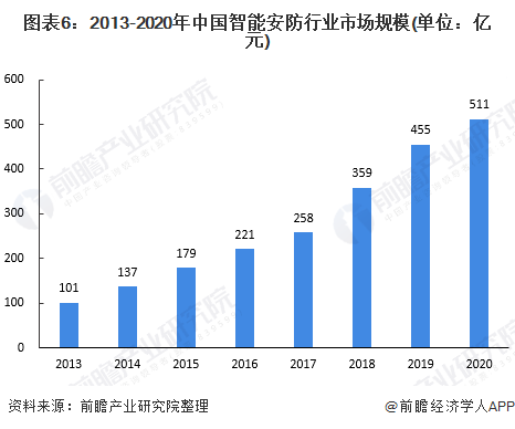 根據(jù)中安網(wǎng)《2020年中國安防行業(yè)調(diào)查報告》,2020年我國安防行業(yè)總產(chǎn)值為8510億元(其中安防產(chǎn)品總產(chǎn)值約為2600億元),根據(jù)2020年我國智能安防滲透率為6%測算,2020年我國智能安防市場規(guī)模約為511億元,2013-2020年市場規(guī)模年復(fù)合增長率達26%。