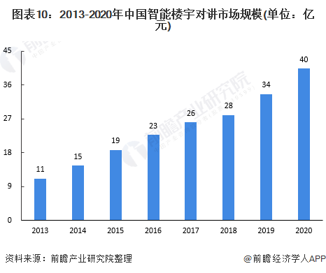近年來,隨著居民生活水平的提高,居民住宅小區(qū)的管理越來越規(guī)范和嚴(yán)謹(jǐn),居民對于樓宇對講系統(tǒng)的性能要求有所提升,不再局限于簡單的語音對講,而逐年向網(wǎng)絡(luò)化、可視化化發(fā)展。數(shù)據(jù)顯示,隨著樓宇對講系統(tǒng)的不斷升級,樓宇對講智能化滲透率不斷提高,目前滲透率在20%左右。2019年中國樓宇對講系統(tǒng)市場規(guī)模為154億元,由此得出2019年中國智能樓宇對講市場規(guī)模約為34億元,2013-2019年復(fù)合增長率為20%。據(jù)估算,2020年市場規(guī)模約為40億元左右。