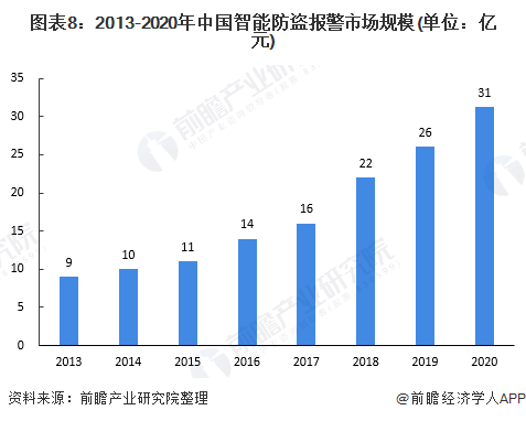 據(jù)中安網(wǎng)數(shù)據(jù)顯示,2020年我國安防行業(yè)總產(chǎn)值8510億元,其中安防產(chǎn)品總產(chǎn)值約為2600億元,結(jié)合防盜報警系統(tǒng)產(chǎn)值占安防產(chǎn)品總產(chǎn)值12%左右,根據(jù)我國智能防盜報警系統(tǒng)滲透率在10%左右測算,得出2020年我國智能防盜報警系統(tǒng)產(chǎn)值約為31億元。