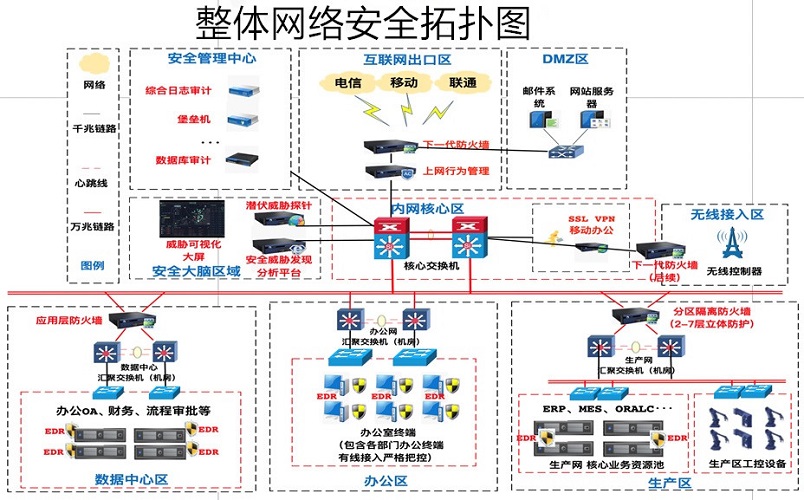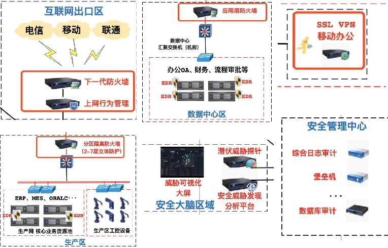 硬件設(shè)備:邊界下一代防火墻(出口邊界)、上網(wǎng)行為管理、分區(qū)防火墻、移動辦公安全