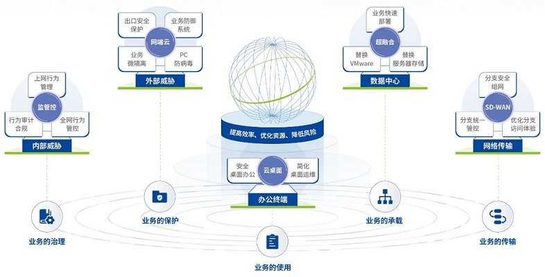 數(shù)字化轉(zhuǎn)型的核心目標是“提高效率、優(yōu)化資源、降低風險”,業(yè)務場景包含“業(yè)務保護、業(yè)務使用、業(yè)務傳輸、業(yè)務承載”,將核心目標與業(yè)務場景相結(jié)合,可明確數(shù)字化轉(zhuǎn)型關(guān)鍵任務為“體系化外部防御、規(guī)范化內(nèi)部治理、敏捷化安全桌面、智能化網(wǎng)絡傳輸、扁平化數(shù)據(jù)中心”。企業(yè)可進一步結(jié)合自身的發(fā)展情況,從最為緊迫的關(guān)鍵任務入手,一步步走好轉(zhuǎn)型之路。