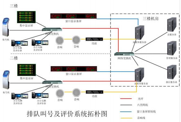一樓、三樓辦事大廳各設(shè)置為一個叫號區(qū)域配套大屏幕電視機。一樓、三樓區(qū)域安裝取票機 1 臺,二 樓區(qū)域安裝取票機 2 臺。各配套大屏幕電視機進行信息集中顯示,以及音響系統(tǒng)進行語音提示。各區(qū)域根