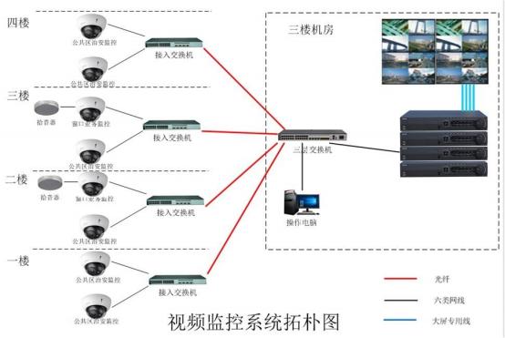 嚴格遵循綜合布線標準,采用六類線、光纖結(jié)合的方式; 所有前端網(wǎng)絡(luò)攝像機通過六類網(wǎng)線全部連 接到各所屬區(qū)域的接入層交換機,再通過光纖或網(wǎng)絡(luò)線連接到監(jiān)控中心的核心交換機。