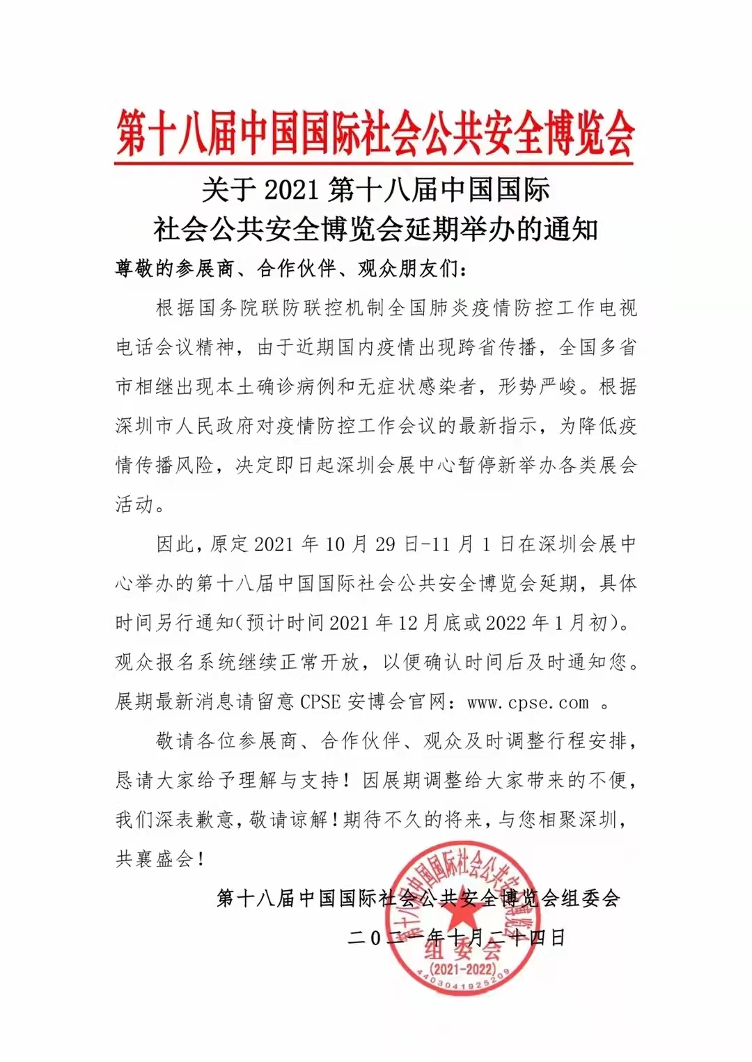 根據(jù)國務(wù)院聯(lián)防聯(lián)控機(jī)制全國肺炎疫情防控工作電視電話會議精神,由于近期國內(nèi)疫情出現(xiàn)跨省傳播,全國多省市相繼出現(xiàn)本土確診病例和無癥狀感染者,形勢嚴(yán)峻。根據(jù)深圳市人民政府對疫情防控工作會議的最新指示,為降低疫情傳播風(fēng)險,決定即日起深圳會展中心暫停新舉辦各類展會活動。
